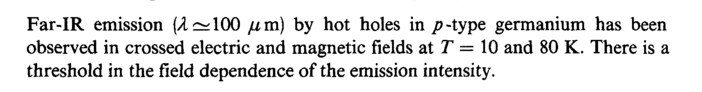 Far-IR emission (Λ^ΙΟΟ μτη) by hot holes in ρ -type germanium has been observed in crossed electric and magnetic fields at Τ = 10 and 80 K. There is a threshold in the field dependence of the emission intensity.