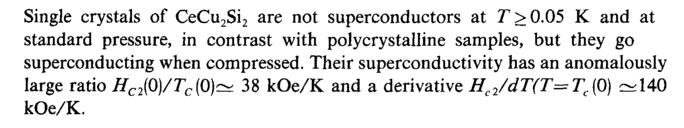 Single crystals of CeCu2Si2 are not superconductors at Τ > 0.05 К and at standard pressure, in contrast with polycrystalline samples, but they go superconducting when compressed. Their superconductivity has an anomalously large ratio Hc2(0)/Tc(0)~ 38 kOe/K and a derivative Hc2/dT(T=Tc(0) —140 kOe/K.