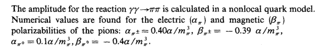 The amplitude for the reaction γγ^ππ is calculated in a nonlocal quark model. Numerical values are found for the electric (απ) and magnetic [βπ) polarizabilities of the pions; απ± ~ 0.40a/ml, βπ±~ —0.39 a/ml, a^o = ОЛа/ml, = — OAa/ml.