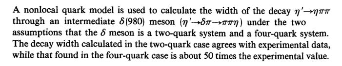 A nonlocal quark model is used to calculate the width of the decay η'^ηττπ through an intermediate <S(980) meson (η'-^δπ—^ππη) under the two assumptions that the δ meson is a two-quark system and a four-quark system. The decay width calculated in the two-quark case agrees with experimental data, while that found in the four-quark case is about 50 times the experimental value.