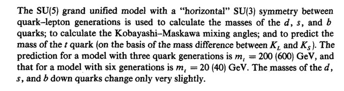 The SU(5) grand unified model with a "horizontal" SU(3) symmetry between quark-lepton generations is used to calculate the masses of the d, s, and b quarks; to calculate the Kobayashi-Maskawa mixing angles; and to predict the mass of the t quark (on the basis of the mass difference between KL and Ks). The prediction for a model with three quark generations is mt = 200 (600) GeV, and that for a model with six generations is mt = 20 (40) GeV. The masses of the d, s, and b down quarks change only very slightly.