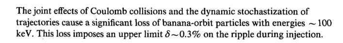 The joint effects of Coulomb collisions and the dynamic stochastization of trajectories cause a significant loss of banana-orbit particles with energies ~100 keV. This loss imposes an upper limit <5~ 0.3% on the ripple during injection.