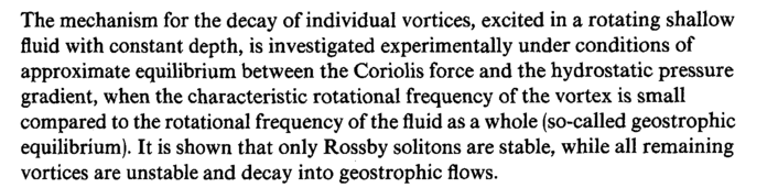 The mechanism for the decay of individual vortices, excited in a rotating shallow fluid with constant depth, is investigated experimentally under conditions of approximate equilibrium between the Coriolis force and the hydrostatic pressure gradient, when the characteristic rotational frequency of the vortex is small compared to the rotational frequency of the fluid as a whole (so-called geostrophic equilibrium). It is shown that only Rossby solitons are stable, while all remaining vortices are unstable and decay into geostrophic flows.