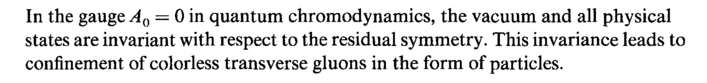 In the gauge A0 = 0 in quantum chromodynamics, the vacuum and all physical states are invariant with respect to the residual symmetry. This invariance leads to confinement of colorless transverse gluons in the form of particles.