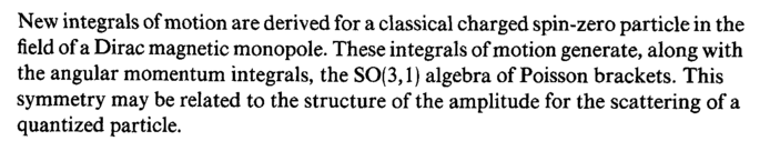 New integrals of motion are derived for a classical charged spin-zero particle in the field of a Dirac magnetic monopole. These integrals of motion generate, along with the angular momentum integrals, the SO(3,l) algebra of Poisson brackets. This symmetry may be related to the structure of the amplitude for the scattering of a quantized particle.