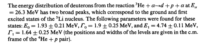 The energy distribution of deuterons from the reaction 3He + a-+d + ρ + a at Ea = 26.3 MeV has two broad peaks, which correspond to the ground and first excited states of the 5Li nucleus. The following parameters were found for these states:£0 1-93 ± 0.21 MeV,T0 = 1.9 ± 0.25 MeV, nndEl = 4.74 ± 0.11 MeV, Γχ = 1.64 ± 0.25 MeV (the positions and widths of the levels are given in the cm. frame of the 4He + ρ pair).