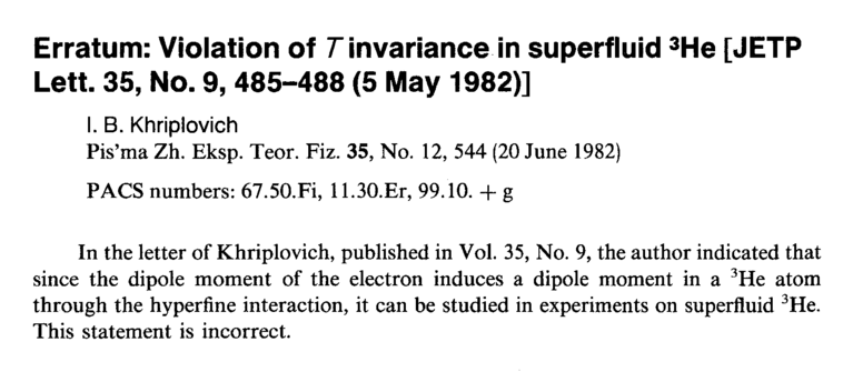 Erratum: Violation of 7" in variance in superfluid 3He [JETP Lett. 35, No. 9, 485-488 (5 May 1982)] I. B. Khriplovich Pis'ma Zh. Eksp. Teor. Fiz. 35, No. 12, 544 (20 June 1982) PACS numbers: 67.50.Fi, ll.30.Er, 99.10. + g In the letter of Khriplovich, published in Vol. 35, No. 9, the author indicated that since the dipole moment of the electron induces a dipole moment in a 3He atom through the hyperfine interaction, it can be studied in experiments on superfluid 3He. This statement is incorrect.