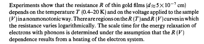 Experiments show that the resistance R of thin gold films (d~5Xl0~7 cm) depends on the temperature Τ (0.4-20 К) and on the voltage applied to the sample (V) in a nonmonotonic way. There are regions on theR (Τ) and R (V) curves in which the resistance varies logarithmically. The scale time for the energy relaxation of electrons with phonons is determined under the assumption that the R [V] dependence results from a heating of the electron system.