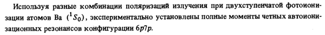 Используя разные комбинации поляризаций излучения при двухступенчатой фотоионизации атомов Ва (1Sq), экспериментально установлены полные моменты четных автоионизационных резонансов конфигурации 6р7р.