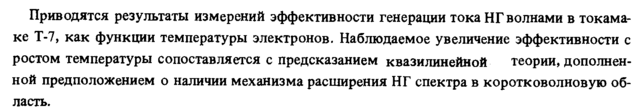 Приводятся результаты измерений эффективности генерации тока НГ волнами в токама-ке Т-7, как функции температуры электронов. Наблюдаемое увеличение эффективности с ростом температуры сопоставляется с предсказанием квазилинейной теории, дополненной предположением о наличии механизма расширения НГ спектра в коротковолновую область.