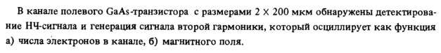 В канале полевого Ga As -транзистора с размерами 2 X 200 мкм обнаружены детектирование НЧ-сигнала и генерация сигнала второй гармоники, который осциллирует как функция а) числа электронов в канале, б) магнитного поля.