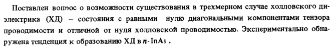 Поставлен воппос о возможности существования в трехмерном случае холловского диэлектрика (ХД) состояния с равными нулю диагональными компонентами тензора проводимости и отличной от нуля холловской проводимостью. Экспериментально обнаружена тенденция к образованию ХД в л-InAs ,