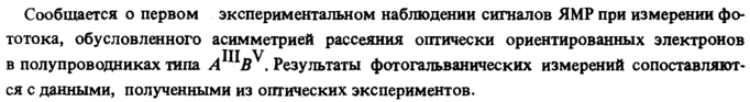 Сообщается о первом экспериментальном наблюдении сигналов ЯМР при измерении фототока, обусловленного асимметрией рассеяния оптически ориентированных электронов в полупроводниках типа А^В^, Результаты фотогальванических измерений сопоставляются с данными, полученными из оптических экспериментов.