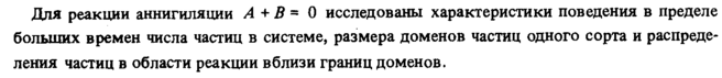 Для реакции аннигиляции А + В = 0 исследованы характеристики поведения в пределе больших времен числа частиц в системе, размера доменов частиц одного сорта и распределения частиц в области реакции вблизи границ доменов.