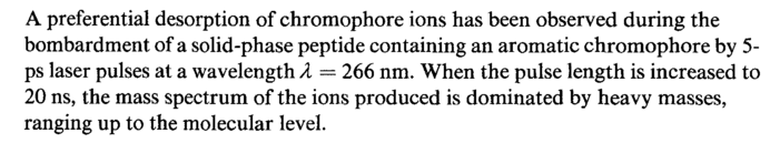 A preferential desorption of chromophore ions has been observed during the bombardment of a solid-phase peptide containing an aromatic chromophore by 5-ps laser pulses at a wavelength λ = 266 nm. When the pulse length is increased to 20 ns, the mass spectrum of the ions produced is dominated by heavy masses, ranging up to the molecular level.