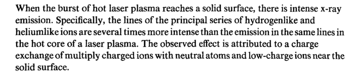 When the burst of hot laser plasma reaches a solid surface, there is intense x-ray emission. Specifically, the lines of the principal series of hydrogenlike and heliumlike ions are several times more intense than the emission in the same lines in the hot core of a laser plasma. The observed effect is attributed to a charge exchange of multiply charged ions with neutral atoms and low-charge ions near the solid surface.