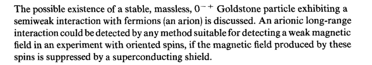 The possible existence of a stable, massless, 0~ + Goldstone particle exhibiting a semiweak interaction with fermions (an arion) is discussed. An arionic long-range interaction could be detected by any method suitable for detecting a weak magnetic field in an experiment with oriented spins, if the magnetic field produced by these spins is suppressed by a superconducting shield.