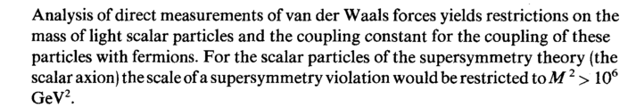 Analysis of direct measurements of van der Waals forces yields restrictions on the mass of light scalar particles and the coupling constant for the coupling of these particles with fermions. For the scalar particles of the supersymmetry theory (the scalar axion) the scale of a supersymmetry violation would be restricted to Μ 2 > 106 GeV2.