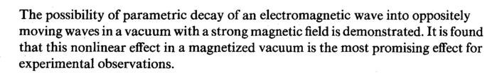 The possibility of parametric decay of an electromagnetic wave into oppositely moving waves in a vacuum with a strong magnetic field is demonstrated. It is found that this nonlinear effect in a magnetized vacuum is the most promising effect for experimental observations.