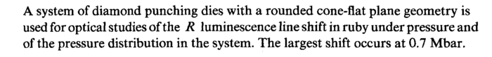 A system of diamond punching dies with a rounded cone-flat plane geometry is used for optical studies of the R luminescence line shift in ruby under pressure and of the pressure distribution in the system. The largest shift occurs at 0.7 Mbar.