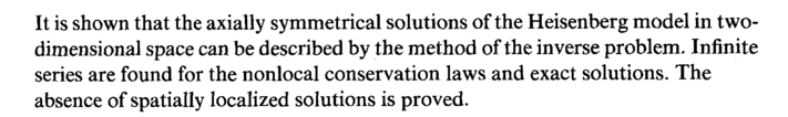 It is shown that the axially symmetrical solutions of the Heisenberg model in two-dimensional space can be described by the method of the inverse problem. Infinite series are found for the nonlocal conservation laws and exact solutions. The absence of spatially localized solutions is proved.