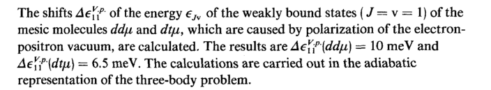 The shifts Δε if' of the energy ejv of the weakly bound states (/ = ν = 1) of the mesic molecules άάμ and άίμ, which are caused by polarization of the electron-positron vacuum, are calculated. The results are Δβ\^(άάμ) = 10 meV and Δ€\\ρ\άίμ) = 6.5 meV. The calculations are carried out in the adiabatic representation of the three-body problem.