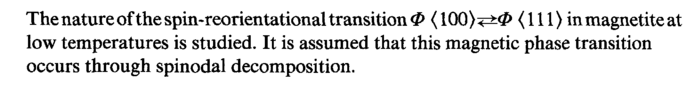 The nature ofthespin-reorientational transition Φ (100)^>Ф (Ш) inmagnetiteat low temperatures is studied. It is assumed that this magnetic phase transition occurs through spinodal decomposition.