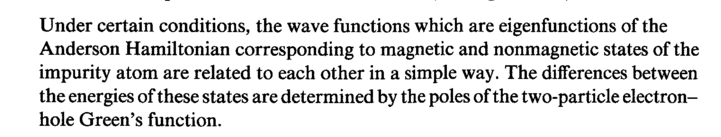 Under certain conditions, the wave functions which are eigenfunctions of the Anderson Hamiltonian corresponding to magnetic and nonmagnetic states of the impurity atom are related to each other in a simple way. The differences between the energies of these states are determined by the poles of the two-particle electron-hole Green's function.
