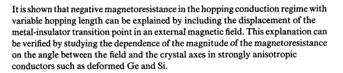 It is shown that negative magnetoresistance in the hopping conduction regime with variable hopping length can be explained by including the displacement of the metal-insulator transition point in an external magnetic field. This explanation can be verified by studying the dependence of the magnitude of the magnetoresistance on the angle between the field and the crystal axes in strongly anisotropic conductors such as deformed Ge and Si.