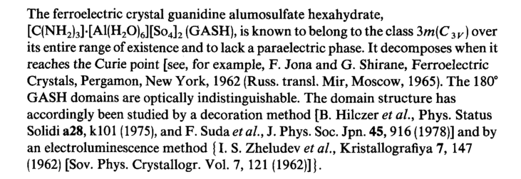 The ferroelectric crystal guanidine alumosulfate hexahydrate, [C(NH2)3]-[Al(H20)6][So4]2 (GASH), is known to belong to the class 3m(C3V) over its entire range of existence and to lack a paraelectric phase. It decomposes when it reaches the Curie point [see, for example, F. Jona and G. Shirane, Ferroelectric Crystals, Pergamon, New York, 1962 (Russ. transl. Mir, Moscow, 1965). The 180° GASH domains are optically indistinguishable. The domain structure has accordingly been studied by a decoration method [B. Hilczer et ah, Phys. Status Solidi a28, klOl (1975), and F. Sudaei a!., J. Phys. Soc. Jpn. 45,916 (1978)] and by an electroluminescence method {I. S. Zheludev et al., Kristallografiya 7, 147 (1962) [Sov. Phys. Crystallogr. Vol. 7, 121 (1962)] j.