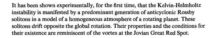 It has been shown experimentally, for the first time, that the Kelvin-Helmholtz instability is manifested by a predominant generation of anticyclonic Rossby solitons in a model of a homogeneous atmosphere of a rotating planet. These solitons drift opposite the global rotation. Their properties and the conditions for their existence are reminiscent of the vortex at the Jovian Great Red Spot.