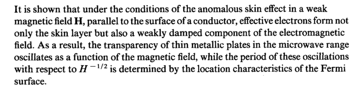 It is shown that under the conditions of the anomalous skin effect in a weak magnetic field H, parallel to the surface of a conductor, effective electrons form not only the skin layer but also a weakly damped component of the electromagnetic field. As a result, the transparency of thin metallic plates in the microwave range oscillates as a function of the magnetic field, while the period of these oscillations with respect to Η ~1/2 is determined by the location characteristics of the Fermi surface.
