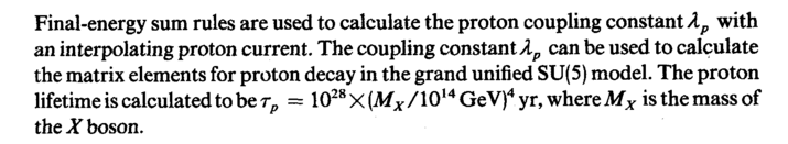 Final-energy sum rules are used to calculate the proton coupling constant λρ with an interpolating proton current. The coupling constant Λρ can be used to calculate the matrix elements for proton decay in the grand unified SU(5) model. The proton lifetime is calculated to be rp = 1028X(M;r/1014GeV)4yr, whereM* isthemassof the X boson.