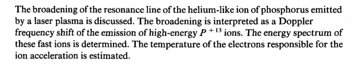 The broadening of the resonance line of the helium-like ion of phosphorus emitted by a laser plasma is discussed. The broadening is interpreted as a Doppler frequency shift of the emission of high-energy Ρ 4-13 ions. The energy spectrum of these fast ions is determined. The temperature of the electrons responsible for the ion acceleration is estimated.