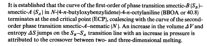 It is established that the curve of the first-order of phase transition smectic-i? (SB )-smectic-Λ (SA) in 7V-(4-«-butyloxybenzylidene)-4-«-octylaniline (BBOA or 40.8) terminates at the end critical point (ECP), coalescing with the curve of the second-order phase transition smectic-^-nematic (N). An increase in the volume Δ Vand entropy AS jumps on the SB-SA transition line with an increase in pressure is attributed to the crossover between twoand three-dimensional melting.