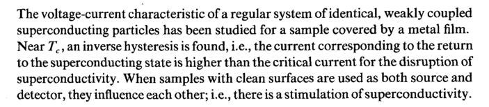 The voltage-current characteristic of a regular system of identical, weakly coupled superconducting particles has been studied for a sample covered by a metal film. Near Tc, an inverse hysteresis is found, i.e., the current corresponding to the return to the superconducting state is higher than the critical current for the disruption of superconductivity. When samples with clean surfaces are used as both source and detector, they influence each other; i.e., there is a stimulation of superconductivity.