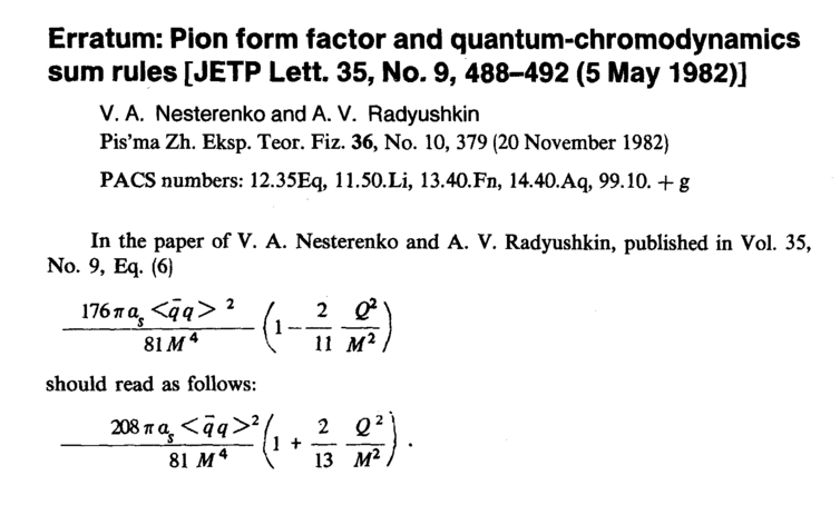 Erratum: Pion form factor and quantum-chromodynamics sum rules [JETP Lett. 35, No. 9,488-492 (5 May 1982)]