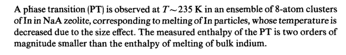 A phase transition (PT) is observed at T~ 235 К in an ensemble of 8-atom clusters of In in NaA zeolite, corresponding to melting of In particles, whose temperature is decreased due to the size effect. The measured enthalpy of the PT is two orders of magnitude smaller than the enthalpy of melting of bulk indium.