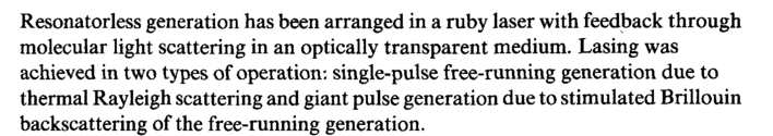 Resonatorless generation has been arranged in a ruby laser with feedback through molecular light scattering in an optically transparent medium. Lasing was achieved in two types of operation: single-pulse free-running generation due to thermal Rayleigh scattering and giant pulse generation due to stimulated Brillouin backscattering of the free-running generation.
