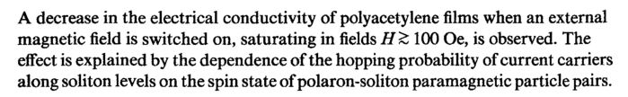 A decrease in the electrical conductivity of polyacetylene films when an external magnetic field is switched on, saturating in fields 100 Oe, is observed. The effect is explained by the dependence of the hopping probability of current carriers along soliton levels on the spin state of polaron-soliton paramagnetic particle pairs.