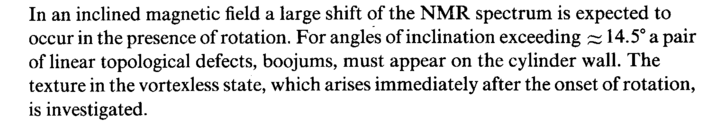 In an inclined magnetic field a large shift of the NMR spectrum is expected to occur in the presence of rotation. For angles of inclination exceeding ~ 14.5° a pair of linear topological defects, boojums, must appear on the cylinder wall. The texture in the vortexless state, which arises immediately after the onset of rotation, is investigated.