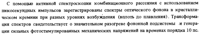 С помощью активной спектроскопии комбинационного рассеяния с использованием пикосекундных импульсов зарегистрированы спектры оптического фонона в кристаллическом кремнии при разных уровнях возбуждения (вплоть до плавления). Трансформация спектров свидетельствует о значительном разогреве фононной подсистемы и генерации сильных фотостимулированных механических напряжений на временах порядка 10 пс.