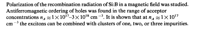 Polarization of the recombination radiation of Si.B in a magnetic field was studied. Antiferromagnetic ordering of holes was found in the range of acceptor concentrations nA^\X 1017-3 Χ 1018 cm "3, It is shown that at nA ~ 1 χ 1017 cm ~3 the excitons can be combined with clusters of one, two, or three impurities.