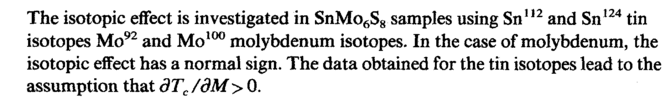 The isotopic effect is investigated in SnMo6S8 samples using Sn112 and Sn124 tin isotopes Mo92 and Mo100 molybdenum isotopes. In the case of molybdenum, the isotopic effect has a normal sign. The data obtained for the tin isotopes lead to the assumption that ÄôÓ /Äí> 0.