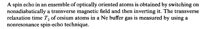 A spin echo in an ensemble of optically oriented atoms is obtained by switching on nonadiabatically a transverse magnetic field and then inverting it. The transverse relaxation time T2 of cesium atoms in a Ne buffer gas is measured by using a nonresonance spin-echo technique.