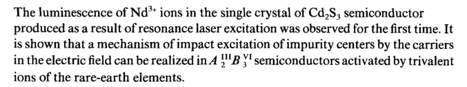 The luminescence of Nd3+ ions in the single crystal of Cd2S3 semiconductor produced as a result of resonance laser excitation was observed for the first time. It is shown that a mechanism of impact excitation of impurity centers by the carriers in the electric field can be realized in ,4 ψ Β \l semiconductors activated by trivalent ions of the rare-earth elements.