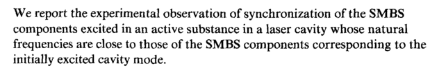 We report the experimental observation of synchronization of the SMBS components excited in an active substance in a laser cavity whose natural frequencies are close to those of the SMBS components corresponding to the initially excited cavity mode.