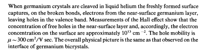 When germanium crystals are cleaved in liquid helium the freshly formed surface captures, on the broken bonds, electrons from the near-surface germanium layer, leaving holes in the valence band. Measurements of the Hall effect show that the concentration of free holes in the near-surface layer and, accordingly, the electron concentration on the surface are approximately 1013 cm ~2. The hole mobility is μ ~ 300 cm2/V sec. The overall physical picture is the same as that observed on the interface of germanium bicrystals.