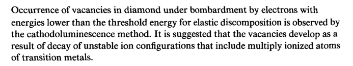 Occurrence of vacancies in diamond under bombardment by electrons with energies lower than the threshold energy for elastic discomposition is observed by the cathodoluminescence method. It is suggested that the vacancies develop as a result of decay of unstable ion configurations that include multiply ionized atoms of transition metals.