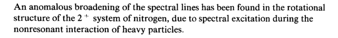 An anomalous broadening of the spectral lines has been found in the rotational structure of the 2 + system of nitrogen, due to spectral excitation during the nonresonant interaction of heavy particles.